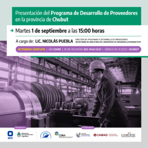 La presentación del Programa de Desarrollo de Proveedores en la provincia del Chubut estará a cargo del Lic. Nicolás Puebla – Director del Programa de Desarrollo de Proveedores, de la Secretaría de Industria del Ministerio de Desarrollo Productivo de la Nación – y acompañado por nuestra Institución.